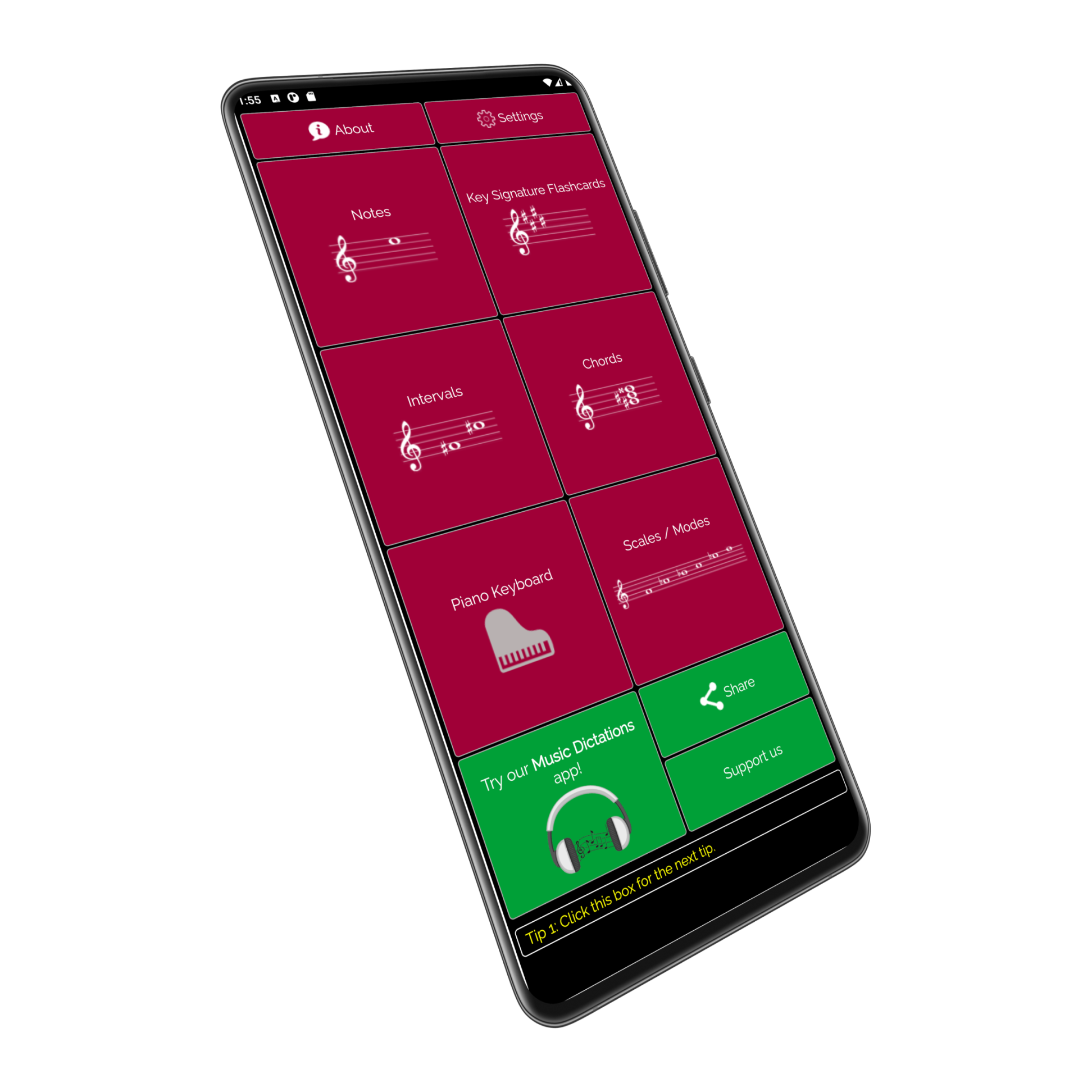Sight reading and ear training. Notes, Intervals, Chords, Scales, and more.
